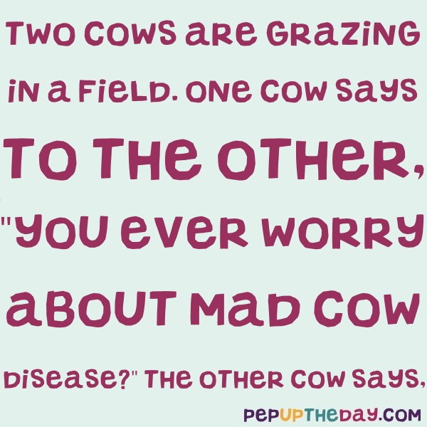 Joke: Two cows are grazing in a field. One cow says to the other, "You ever worry about that mad cow disease?" The other cow says,